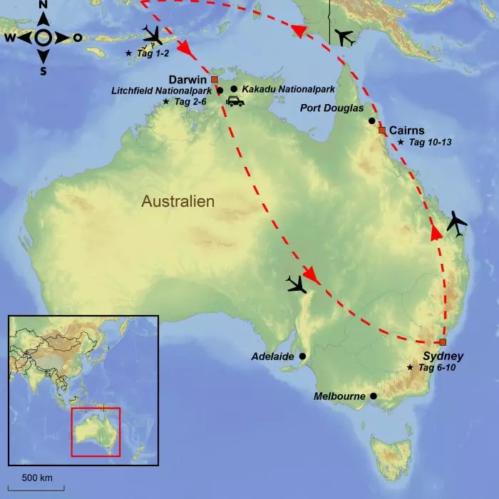 Heute reisen Sie vom ausgewählten Flughafen ab. Es geht mit Zwischenlandungen nach Australien.