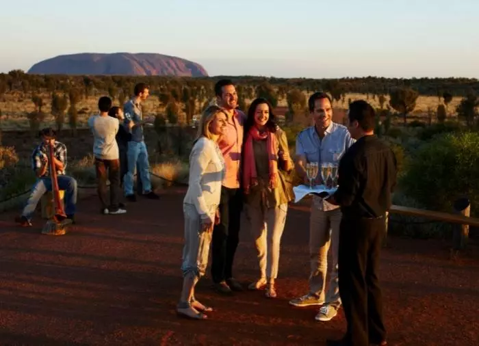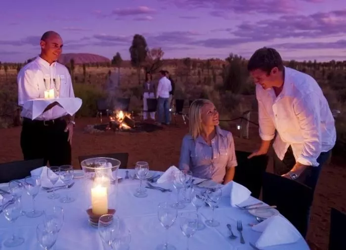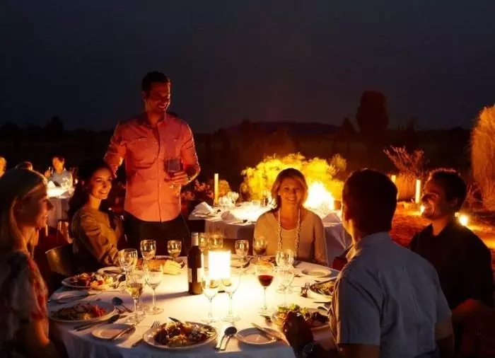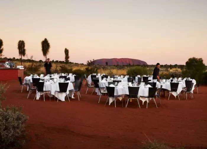 Genießen Sie das Abendessen unter dem Sternenhimmel im preisgekrönten Restaurant Sounds of Silence. Mitten in der australischen Wüste werden Sie mit einem edlen Gläschen empfangen. Im Hintergrund hören Sie ein Didgeridoo, während langsam die Sonne über Uluru untergeht. Wenn sich die Dunkelheit um sie schmiegt, serviert der Gastgeber ein leckeres, australisches BBQ, bei dem Sie interessante, australische Spezialitäten kosten können. Das Abendessen wird als Buffet serviert und an großen Tischen mit ca. 10 Gästen pro Tisch eingenommen. Danach erzählt ein Astronom mehr über den unendlichen Sternenhimmel über Ihnen.