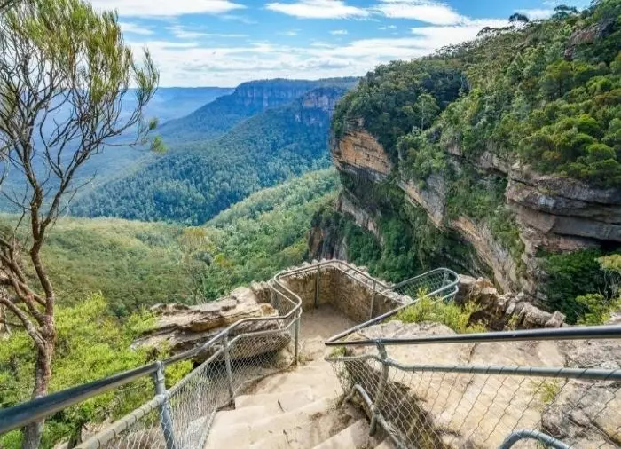 Danach geht es weiter zu den Blue Mountains. Die Route wird vorab nicht vollständig geplant, da man so Wetter und Verkehr berücksichtigen kann. Die berühmtesten Aussichtspunkte aber gehören immer zur Route: Three Sisters und Pulpit Rock. Aber es besteht auch die Möglichkeit, einige der weniger bekannten Gebiete und Aussichtspunkte zu besuchen.
