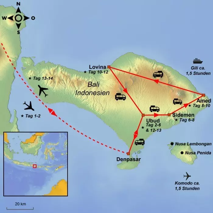 Die Reise beginnt im Kulturzentrum Balis, Ubud, das im zentralen Hochland liegt, umgeben von grünen Reisfeldern, tiefen Tälern und rauschenden Flüssen. Die Häuser sind wunderschön, die Tempel gut besucht. Die Stadt hat einen ganz besonderen Charme und eine tolle Atmosphäre, die beinahe ein Bohème-Flair erzeugt. Hier dreht sich alles um Traditionen und Religion, Handwerk und Kunst und nicht zuletzt um leckere kulinarische Erlebnisse.