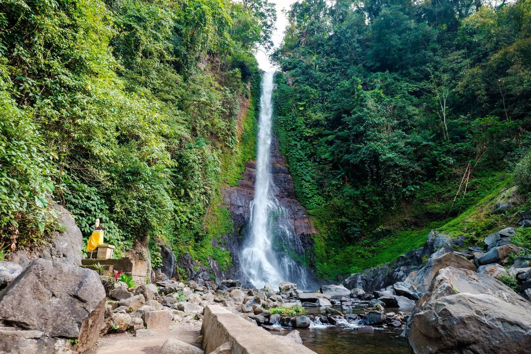 Der letzte Besuch gilt dem faszinierenden und fotogenen Wasserfall Tukad Cepung, der wie ein verstecktes Juwel mitten im Dschungel, östlich des Tempels Pura Kehen liegt. Vom Parkplatz führen Treppen in den Dschungel hinunter. Nach ca. 20 Minuten kommen Sie unten an. Sie gehen einen Weg an einem Wasserlauf entlang. Unterwegs können Sie die grüne Umgebung bestaunen. Bitte beachten Sie, dass Sie das letzte Stück Weg zum Wasserfall direkt im Wasser gehen. Denken Sie daher an gute Schuhe, die nass werden können! Beim Anblick von Tukad Cepung verschlägt es vielen die Sprache. Der Wasserfall stürzt 15 Meter zwischen den beeindruckenden Felsformationen in die Tiefe. Bei schönem Wetter sehen Sie, wie die Sonnenstrahlen in die Höhle scheinen und ein atemberaubendes Bild erzeugen.