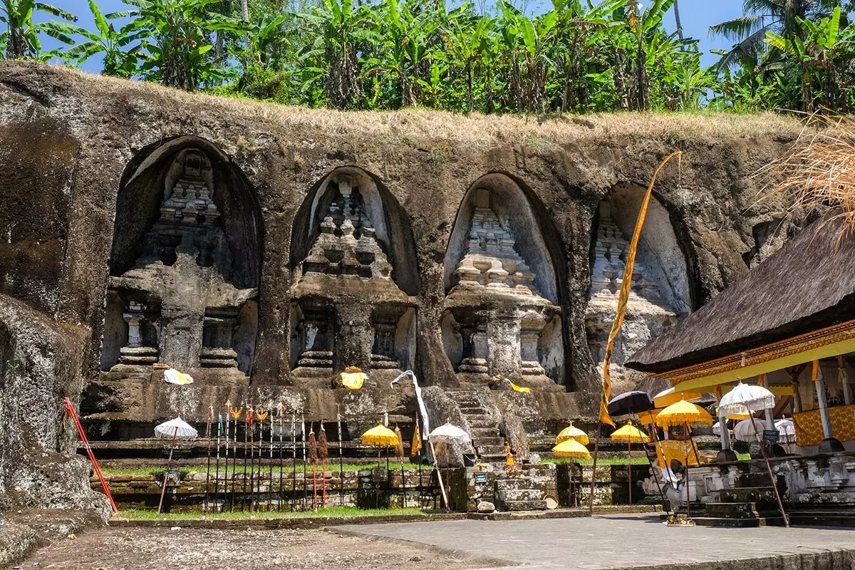 Von Pura Tirta Empul werden Sie zur Tempelanlage Gunung Kawi gefahren, einem der ältesten Tempel Balis. Gunung Kawi liegt mitten in einem Tal mit grünem Dschungel. Treppen führen an grasgrünen Reisterrassen und hohen Palmen zur Tempelanlage hinunter. Am Tempel Gunung Kawi fließt auch der Fluss Pakerisan vorbei, welcher für die balinesischen Hindu eine religiöse Bedeutung hat. Es wird nämlich erzählt, dass Wasser, welches an einem Heiligtum vorbeiläuft, zu Weihwasser wird. Am Fluss gehen Sie über eine kleine Steinbrücke zur Hauptattraktion von Gunung Kawi, nämlich zum alten Königsgrab, das in die Felsen gehauen wurde. Sie haben Zeit, um sich umzusehen und diesen uralten friedlichen Ort aus dem 11. Jahrhundert zu bewundern.