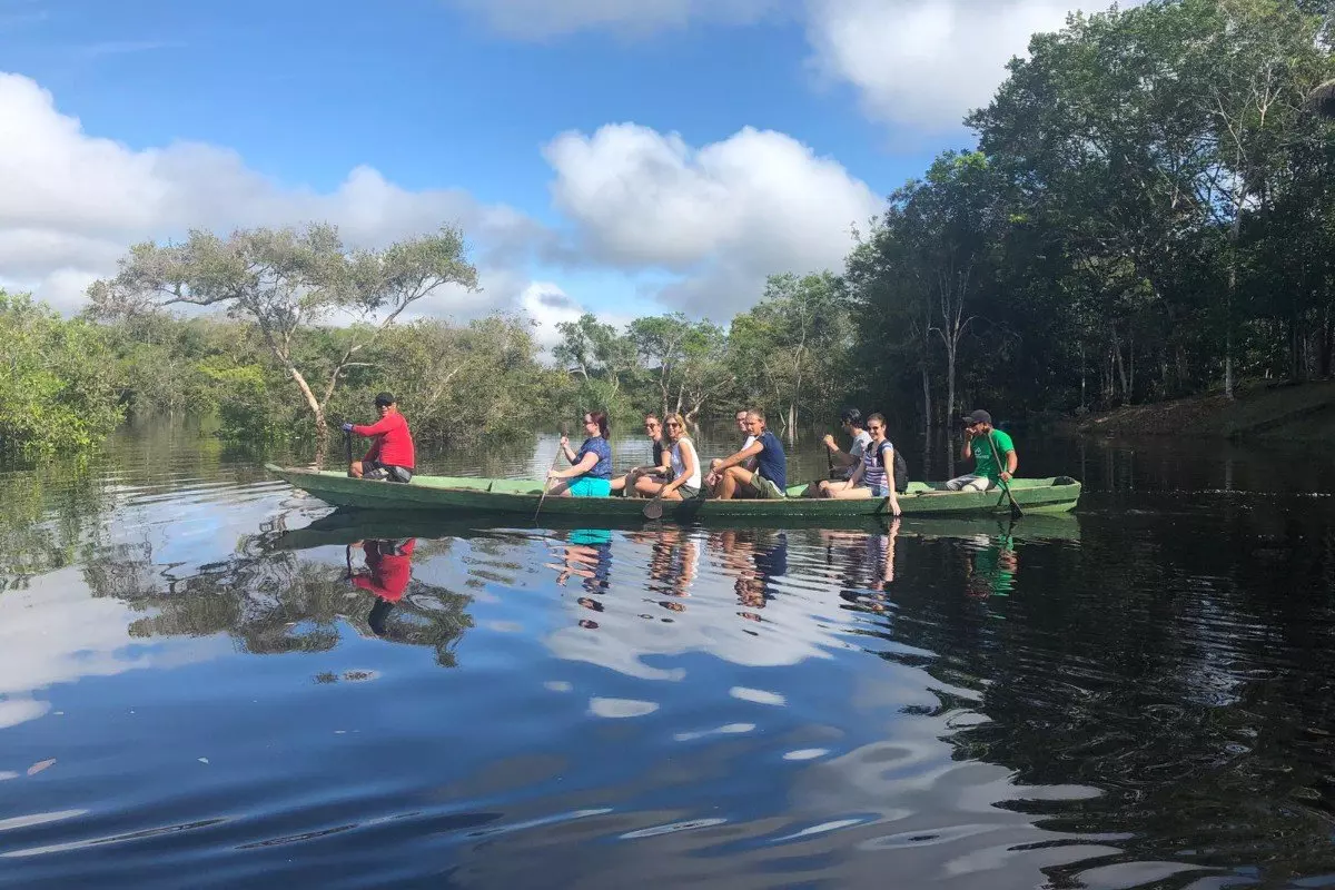 Der Tag beginnt früh mit einem rund 4-stündigen Transfer zu Ihrer Dschungel-Lodge, in der Sie die nächsten 3 Nächte verbringen. Sie werden zum Hafen gebracht, von wo aus Sie mit dem Schiff zur kleinen Stadt Villa do Careiro fahren. Von dort werden Sie zum Fluss Tupana gebracht und fahren das letzte Stück mit dem Boot zur Lodge. Und der Transport ist nicht einfach nur ein Transport zur Lodge, sondern der Anfang Ihres Amazonas-Abenteuers. Sie erleben u. a. den Ort, an dem die beiden großen Flüsse Rio Negro und Rio Solimões zusammenfließen und zum Amazonas werden. Der eine Fluss ist braun und schlammig, während der andere schwarz ist. Die Trennlinie zwischen den beiden Flüssen ist deutlich erkennbar. Dieses fantastische Phänomen wird auch „Treffen der Wasser“ genannt.
