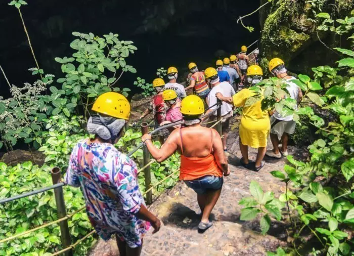 Sie sind mit einer kleineren Gruppe unterwegs und bewegen sich mit einem Guide 300 Meter über steile Stufen hinunter, die aus den Kalksteinfelsen gehauen wurden, aus denen die Höhle besteht. Sie machen unterwegs Pausen, in denen Sie die schöne Höhle bewundern können, während der Guide mehr über die verschiedenen geologischen Formationen, die es hier gibt, erzählt: Stalaktiten, Stalagmiten und weitere Kalksteinablagerungen. Am Fuße der Treppe ist ein Plateau, auf dem Sie die wunderschöne Umgebung ausgiebig bestaunen und viele tolle Fotos machen können. Der See in der Höhle ist an seinem tiefsten Punkt mehr als 80 Meter tief und beherbergt seltene Albinoshrimps sowie Knochen von Säbelzahntigern und Riesenfaultieren, die vor mehr als 12.000 Jahren in dieser Region lebten.