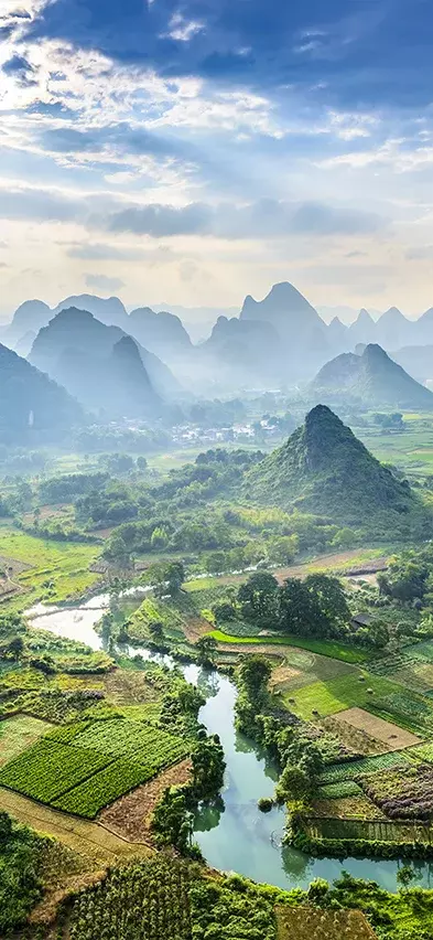 Yangshuo liegt in einer fast poetischen, einfach atemberaubenden Landschaft. Der Fluss Li verläuft zwischen den hohen Kalksteinbergen, die wie stolze Buckel aus der Landschaft aufragen. Etwas außerhalb der Stadt können Sie die fleißigen einheimischen Bauern beobachten, die Reis-, Gemüse- und Blumenfelder bewirtschaften.