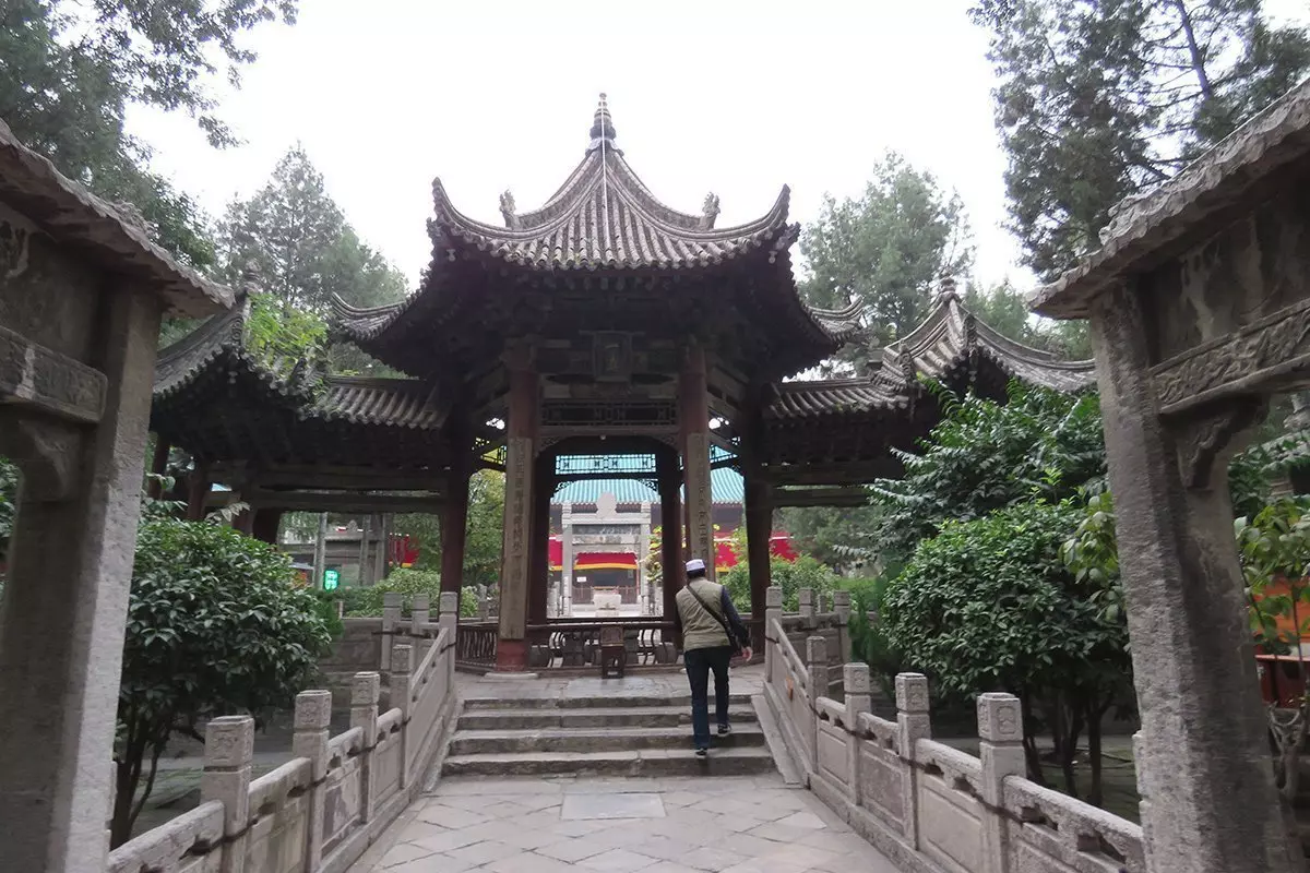 Zuerst besuchen wir bei der Führung die Große Moschee, die älteste und größte Moschee in China. Ursprünglich wurde sie im Jahr 742 während der Tang-Dynastie errichtet, da sich zu dieser Zeit viele arabische Handelsleute in der Stadt aufhielten. Später wurde sie renoviert und mehrere Male erweitert. Obwohl es sich um eine Moschee handelt, ist der Baustil chinesisch. Sie besitzt ein Satteldach, Gärten und Pavillons, allerdings mit arabischen Inschriften.