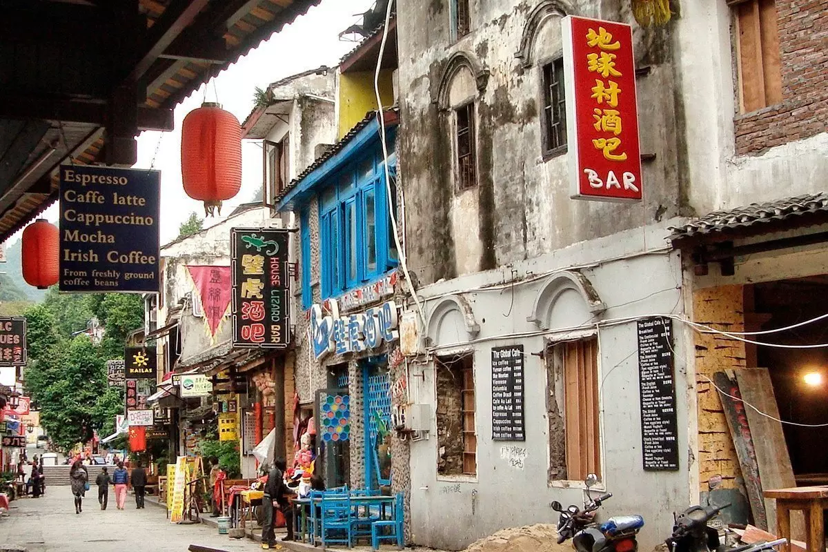 Das Stadtzentrum ist sehr lebhaft. Hier gibt es viele Bars und Restaurants. Besonders die West Street ist ein beliebter Versammlungsort. Die West Street ist die älteste Straße von Yangshuo. Ihre Geschichte ist mehr als 1.400 Jahre alt, was auch an den alten malerischen Häusern ersichtlich ist. Darüber hinaus trifft an diesem Ort der Osten auf den Westen: An der Straße liegen viele Geschäfte, Cafés und Lokale, in denen westliche und chinesische Spezialitäten serviert werden.