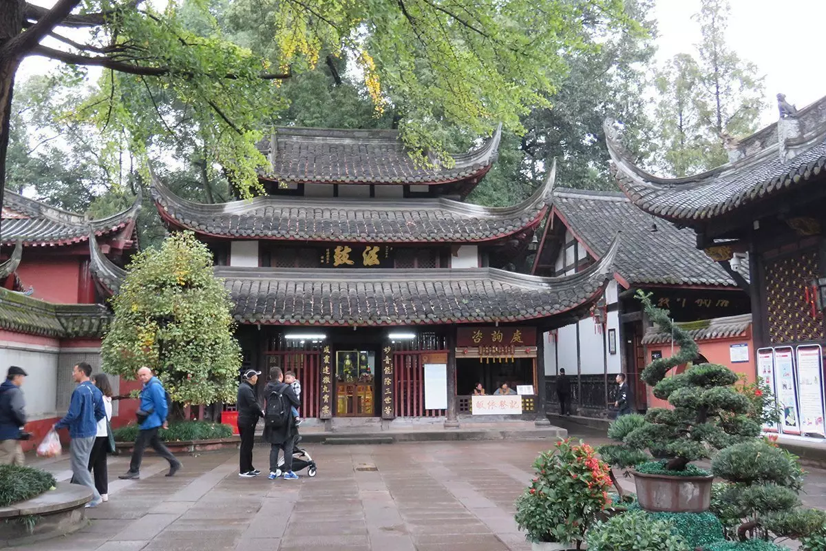 Danach geht es weiter zum Tempel Wenshu. Die Geschichte des Tempels ist interessant und reicht mehr als 1.000 Jahre in die Vergangenheit. Er half dabei, den Buddhismus nach Chengdu zu bringen. Wenshu, der einst Xinxiang hieß, wurde am Ende der Ming-Dynastie von den Bränden des Krieges zerstört. Nur Ruinen blieben zurück, bis ein buddhistischer Mönch im Jahr 1681 der Qin-Dynastie eine kleine Hütte zwischen zwei Bäumen hier baute, in der er leben und seine religiösen Rituale durchführen konnte. Dieser Mönch hieß Cidu. Er wohnte mehrere Jahre in der Hütte und lebte bis zu seinem Tod ein spartanisches Leben. Der Erzählung nach wurde der Mönch Cidu nach seinem Tod eingeäschert. Als der Rauch aufstieg, entstand das Bild von Wenshu. Wenshu ist der chinesische Name für die Weisheitsbodhisattva Manjushri. Das Volk sah Cidu daher als Reinkarnation von Wenshu. Die Renovierung und der Wiederaufbau des Tempels begannen 1697. Fertig war er 1706, wo er auch seinen heutigen Namen erhielt. Der Tempel Wenshu ist heute einer der schönsten und am besten erhaltenen buddhistischen Tempel in China sowie das Zuhause von 80 Mönchen.