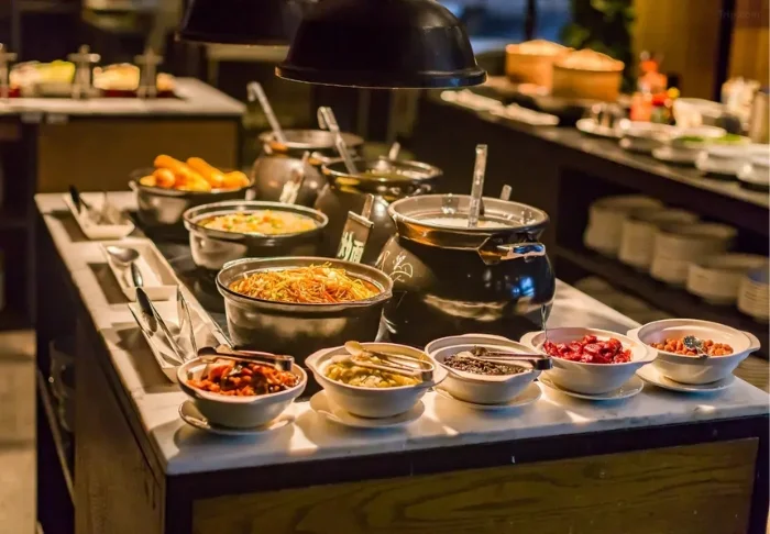 Das Frühstücksrestaurant des Hotels erwartet Sie mit einer großen Auswahl an westlichen und chinesischen Gerichten im großen Frühstücksbuffet.