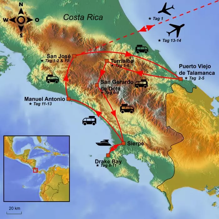 Der absolute Höhepunkt der Reise ist ein Aufenthalt bei Bahía Drake, mit einem Ausflug zum Nationalpark Corcovado, welcher auch als größter Schatz unter den Nationalparks Costa Ricas bezeichnet wird. Dort findet man ein einzigartiges Ökosystem und ein vielfältiges Tierreich, und zwar sowohl an Land als auch unter der Meeresoberfläche vor der Insel Isla del Caño.