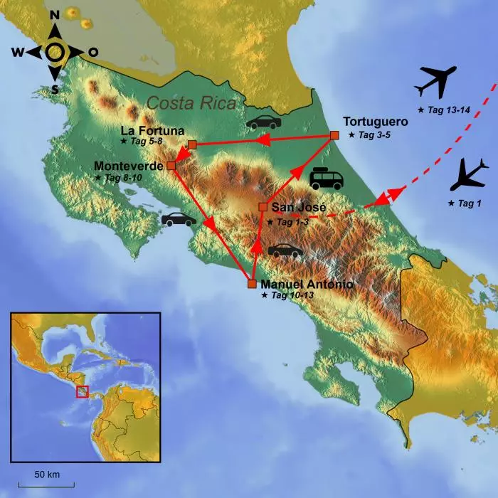 Die Reise beginnt in San José, der Hauptstadt Costa Ricas. Von dort geht es weiter zum Nationalpark Tortuguero, in dem Sie die einzigartige Natur und das faszinierende Tierreich bestaunen können.