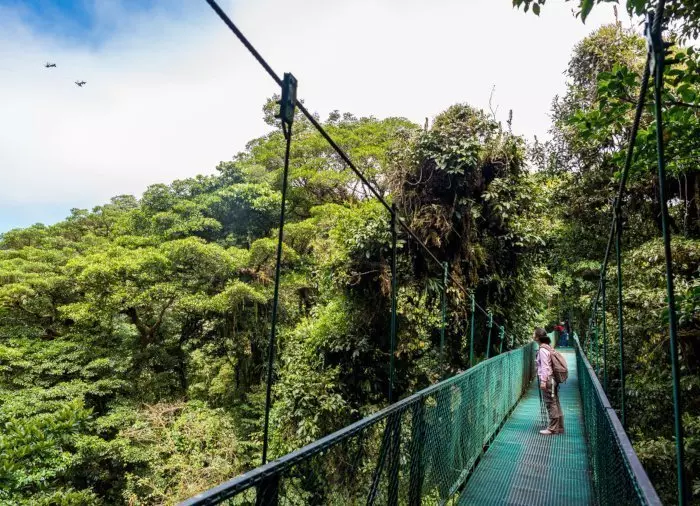 Es erwartet Sie eine aufregende, ca. 2,5 Kilometer lange Wanderung in den Baumwipfeln! Während Sie auf Hängebrücken zwischen den Baumwipfeln gehen, werden Sie die ganz besondere mystische Atmosphäre spüren, welche durch den Nebel in dieser magischen Landschaft entsteht. Sie sind umgeben von Orchideen, Farnen, Moos, riesigen Bäumen und unzähligen Pflanzenarten, die an den Stämmen der Bäume wachsen. In den Baumkronen dieses Zauberwaldes zwitschern bunte Vögel wie der Gelbscheitel-Organist, der Schillerglanzstar, der Quetzal und mehr als 400 weitere Vogelarten. Der Wald ist somit ein wahres Paradies für Vogelliebhaber.