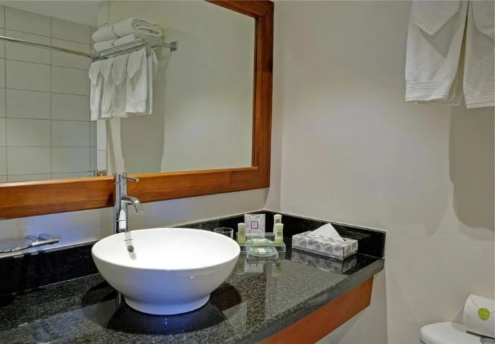 Das Hotel besteht aus strohgedeckten Bungalows in Erdfarben, in denen sich 63 geräumige Zimmer befinden. Alle Zimmer sind mit gemütlichen Betten, einem Sofa, einem Schreibtisch, einer Minibar bzw. einem Kühlschrank, einem Safe, einer Klimaanlage, einem Flachbildschirm-TV-Gerät, einem Telefon, einer Kaffeemaschine und einem eigenen Badezimmer mit Föhn ausgestattet. Darüber hinaus gehört zu jedem Zimmer ein Balkon oder einer Terrasse. Dort können Sie sich hinsetzen und entspannen, während Sie die wunderschöne Umgebung bewundern.