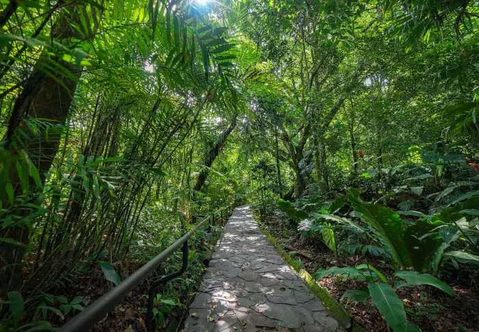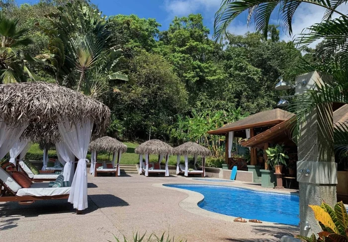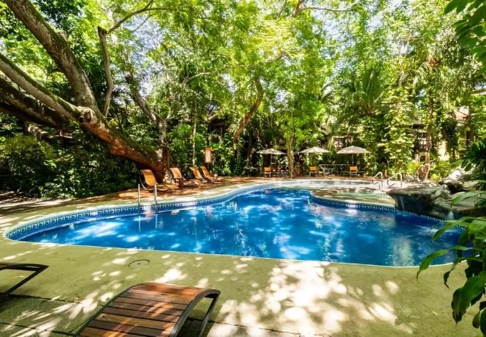 Im attraktiven Poolbereich des Hotels laden die Sonnenliegen zum Verweilen ein. Dort können Sie entspannen, die üppige Vegetation genießen und den Geräuschen des Waldes lauschen.
