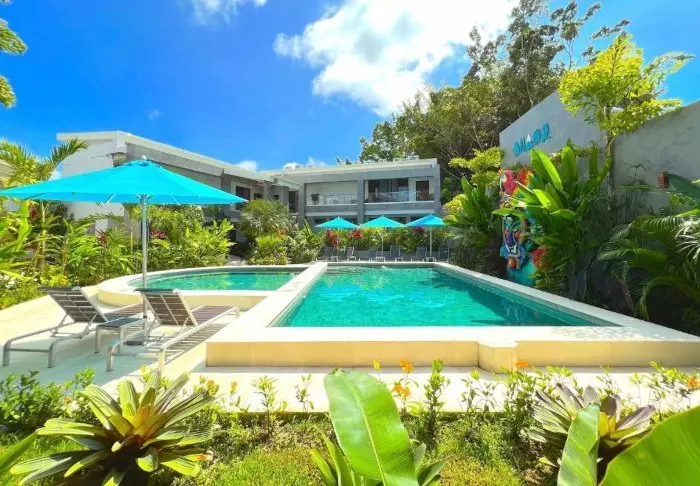Hinter hohen Palmen und tropischen Pflanzen versteckt sich eine wahre Perle, das Hideaway Hotel.