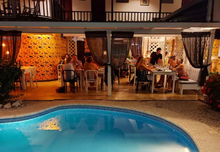 Das Hotel ist ans Restaurant Mama Gui angebaut. Das im Preis enthaltene Frühstück wird dort serviert. Das Restaurant ist außerdem für Mittagessen und Abendessen geöffnet. Sie können eine interessante Mischung aus italienischer und costa-ricanischer Küche genießen.