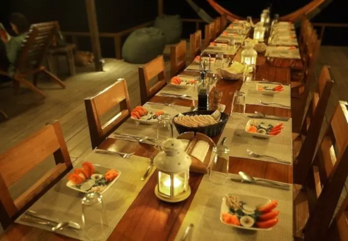 Sie können die Umgebung aber auch vom Loungebereich und dem Restaurant auf dem großen überdachten Veranda aus genießen. Hier werden Frühstück (im Preis inbegriffen), Mittagessen und Abendessen serviert. Das Abendessen ist ein ganz besonderes Erlebnis. Das Menü besteht nämlich aus mehreren Gerichten, die gemeinsam mit den anderen Gästen an einem großen Tisch eingenommen werden, sodass man sich miteinander über die Erlebnisse des Tages unterhalten kann. Bitte beachten Sie, dass das Abendessen beim Frühstück reserviert werden muss und nicht im Preis enthalten ist.