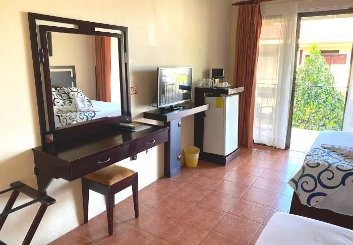 Das Hotel auf 2 Etagen bietet lediglich 24 Zimmer, die alle eine eigene Terrasse oder einen eigenen Balkon mit Aussicht auf den blühenden Garten oder einen der beiden kleinen Swimmingpools haben. Die Zimmer sind sehr bunt und etwas älter, aber es ist alles vorhanden, was man so braucht: TV, Deckenventilator, Klimaanlage, Kühlschrank, Safe und eine eigene Toilette.