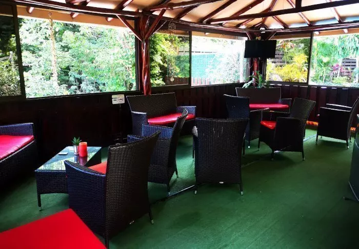 Im überdachten Restaurant des Hotels ist die Aussicht auf die grüne Umgebung ebenfalls herrlich. Hier wird das im Preis inbegriffene Frühstück serviert. Sie können hier außerdem sowohl Mittag- als auch Abendessen bestellen. Mitten im grünen Garten des Hotels befindet sich der Swimmingpool, in dem Sie ein Bad nehmen können oder an dem Sie einfach nur in einem Liegestuhl entspannen können, während Sie die Aussicht auf den beeindruckenden Vulkan Arenal bestaunen.