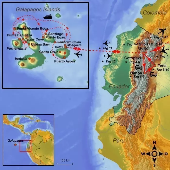 Nach dem Besuch des Zentrums werden Sie über die Insel zum Itabaca-Kanal gefahren, wo eine Fähre Sie nach Baltra, der Flughafeninsel, bringt. Von dort fliegen Sie zurück nach Quito. Der Rückflug dauert aufgrund eines kurzen Zwischenstopps in der Stadt Guayaquil oft etwas länger (ca. 2,5 bis 4 Stunden).