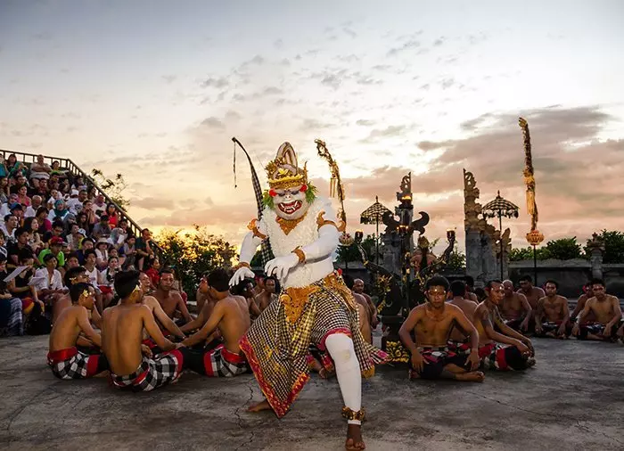 In der Dämmerung, während des Sonnenuntergangs, wird der traditionelle balinesische Kecak-Tanz von einer großen Gruppe männlicher Tänzer aufgeführt. Der berühmte balinesische Tanz erzählt die uralte Geschichte von König Rahwana, welcher die Frau Ramas, Sita, gefangen nimmt. Der Tanz schildert den Kampf zwischen Rahwana und dem Führer der Affen, Hanoman.