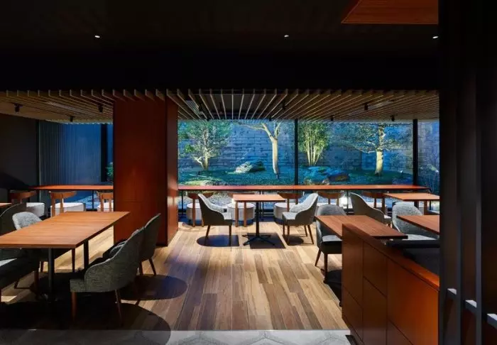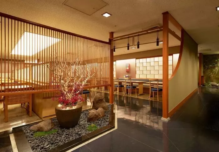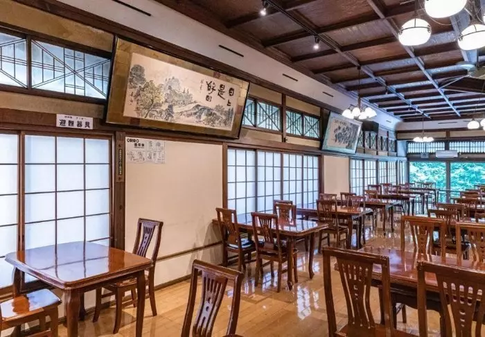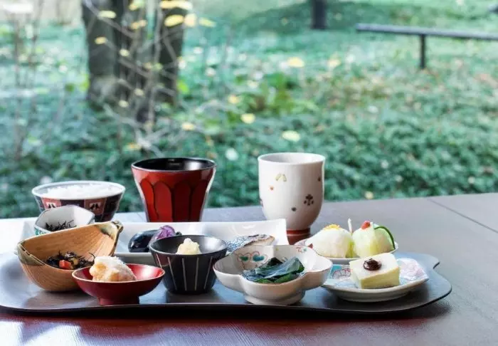 Das Restaurant Noukabanzai Mantei hat morgens und abends geöffnet. In diesem wird das Essen noch auf traditionelle Weise, wie es in den nahegelegenen Provinzen Kaga und Noto üblich ist, zubereitet. Und auch Gemüse, Fleisch und Gewürze stammen aus diesen Regionen. Vom Restaurant aus können Sie den wunderschönen Zen-Garten mit Steinen, Kies, Büschen und Bäumen bewundern.