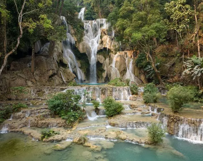 Nach einem leckeren Mittagessen erwartet Sie eine Fahrt von 30 km zum Kuang-Si-Wasserfall südlich von Luang Prabang. Vielleicht ist hier ein erfrischendes Bad eine verlockende Aussicht? Umgeben von üppigem tropischem Dschungel stürzt der Kuang Si-Wasserfall in Kaskaden über drei Ebenen einen steilen Hügel hinunter. Der längste Fall ist 60 Meter, und auf der untersten Ebene können Sie sich im türkisfarbenen Wasser der ruhigen Pools abkühlen.