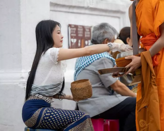 Heute beteiligen Sie sich an einer guten Tat im Sinne des Buddhismus: Almosen verteilen. Das Verteilen von Almosen wird als wichtige religiöse Praxis im buddhistischen Glauben und in der Kultur von Laos angesehen . Sie können beispielsweise Mönchen Geschenke machen, an religiösen Zeremonien teilnehmen und bedürftigen Menschen helfen. Es ist ein Akt der Wohltätigkeit und des Mitgefühls. Diese Taten sollen Glück bringen und zu einem gesunden und glücklichen Leben mit Wohlstand und spirituellem Wohlbefinden beitragen, sowohl im gegenwärtigen Leben als auch bei zukünftigen Wiedergeburten.