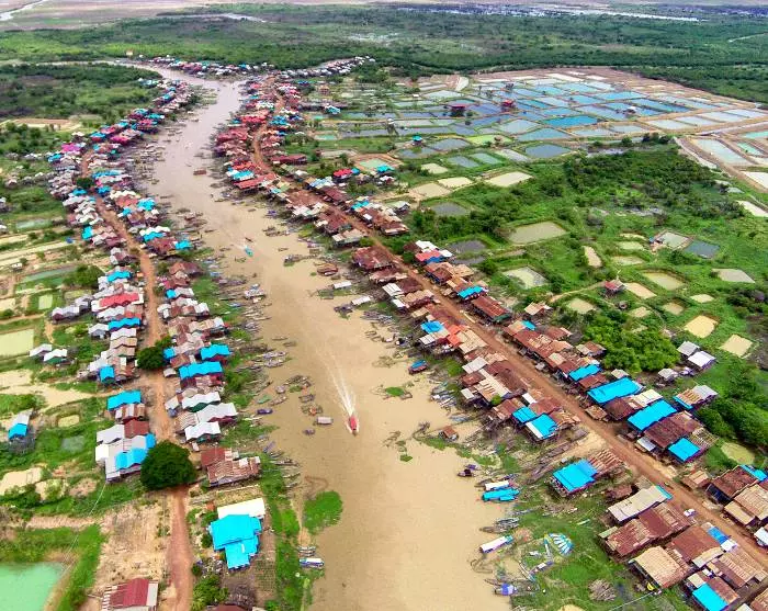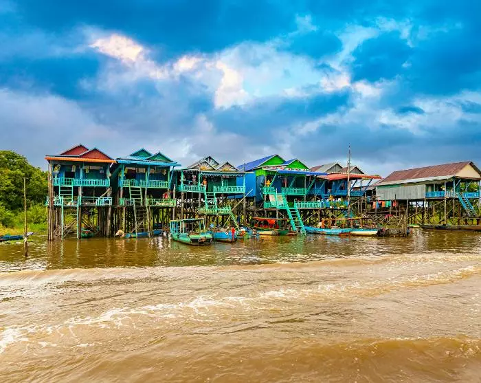 Die Tour geht weiter zum Tonle Sap Lake. Hier fahren Sie mit dem Boot zu einem der vielen Fischerdörfer am See, entweder Kompong Khleang (zwischen August und Anfang Februar) oder Chong Khneas (zwischen Mitte Februar und Juli). Im Dorf erfahren Sie mehr über den Alltag der vielen Familien, die primär vom Fischfang leben. Die Familien leben in bunten Häusern, die am Seeufer auf langen Stelzen stehen. So sind sie während der Regenzeit (August bis Anfang Februar) vor den hohen Wasserständen geschützt, wenn sich die engen Gassen des Dorfes in kleine Kanäle verwandeln. Während der Trockenzeit, wenn der Wasserstand niedrig ist, ragen die langen Stelzen aus dem Wasser.