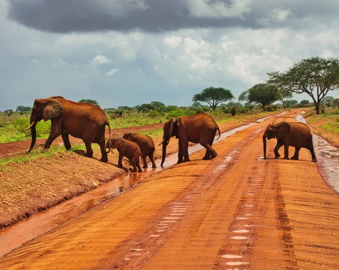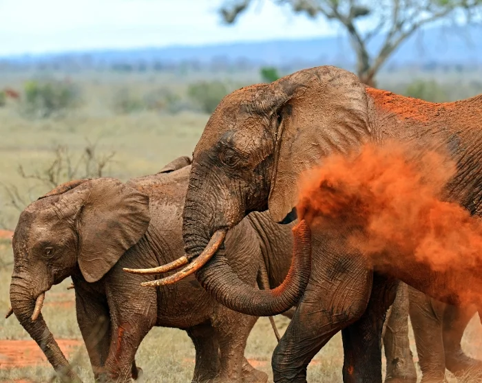 Die roten Elefanten im Park (sie bekommen ihre rote Färbung durch den Boden) sind für viele ein absolutes Highlight. Tatsächlich kann Tsavo die größte Elefantenpopulation in ganz Kenia vorweisen – geschätzt auf etwa 15.000 Tiere.
