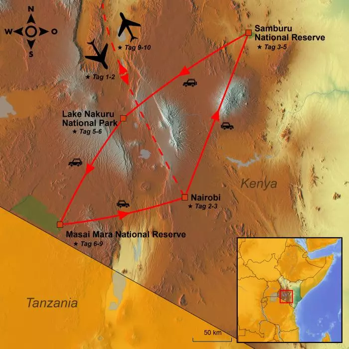 Sie überqueren den Äquator und können das fantastische und vielfältige Tierreich in den Wildreservaten Samburu-Wildreservat und Masai Mara hautnah erleben. Zuerst erleben Sie die „Besonderen Fünf“ und die einzigartige Landschaft mit ihren charakteristischen Akazienbäumen, die den Tieren der Savanne Schatten spenden. Sie erleben die fantastische Landschaft am 5.000 km langen Großen Afrikanischen Grabenbruch, mit Wasserfällen, Vulkankratern, und den Nationalpark Lake Nakuru, der für seine vielen Nashörner berühmt ist. Es besteht außerdem die Möglichkeit, die großen, in rot gekleideten Masai in ihren Dörfern zu besuchen.
