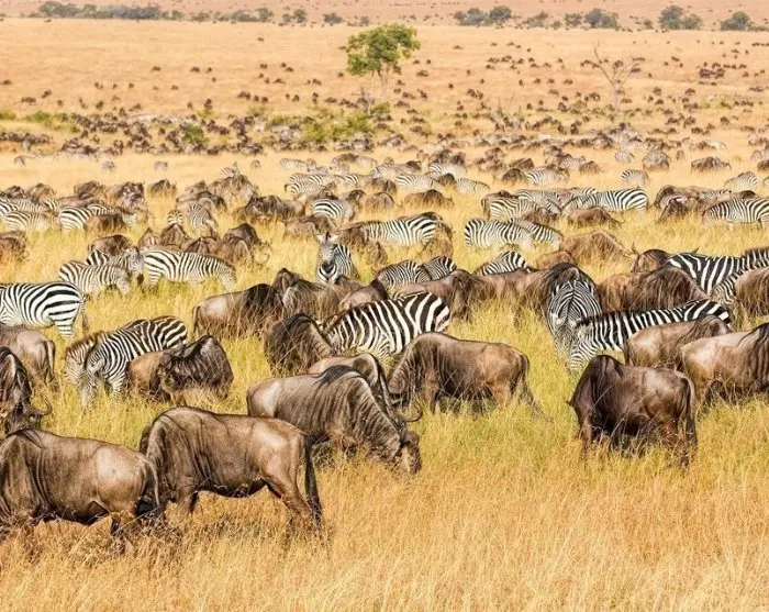 Es geht weiter zum fantastischen Wildreservat Masai Mara, dem kenianischen Teil dieses gigantischen Serengeti-Ökosystems. Während der Regenzeit lebt hier die absolut größte Konzentration an Wildtieren auf der Welt. Von Juli bis Oktober kann man die 1.200 km lange Wanderung der über eine Million Gnus und der Hunderttausenden an Zebras sowie jede Menge Thompsongazellen auf der Suche nach Wasser und frischem Gras bestaunen. Während dieser Wanderung fallen viele den riesigen Nilkrokodilen zum Opfer, wenn sie den Mara River überqueren.