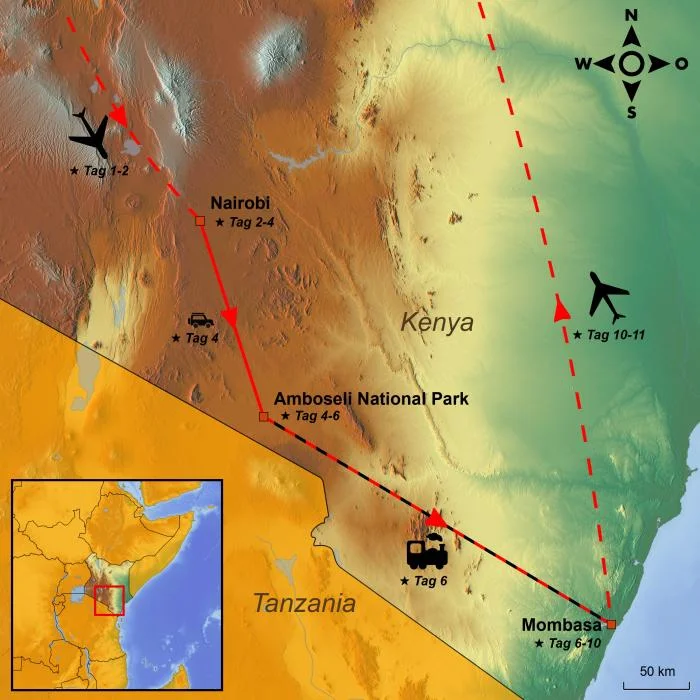 Heute beginnt Ihre Reise mit dem Abflug vom gewählten Flughafen nach Kenia in Ostafrika mit Zwischenlandung(en) unterwegs.