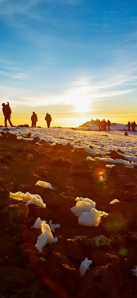 Am Stella Point gibt es einen kurzen Aufenthalt, um u.a. einen einmalig schönen, knallroten Sonnenaufgang zu bewundern. Von hier aus folgen Sie dem oberen Teil der Coca Cola Strecke; aber zögern Sie bitte nicht zu lange, weil es Ihnen sonst wegen der Kälte und Müdigkeit fast unmöglich erscheinen mag, wieder weiter gehen zu können. Je nach Jahreszeit und unlängsten Stürmen besteht das Risiko, daß Sie auf der letzten Strecke entlang des Randes nach Uhuru Peak – dem entgültigen Ziel – auf Schnee stossen werden. Der Gipfel vom Kilimanjaro, ja, die höchste Spitze von Afrika!