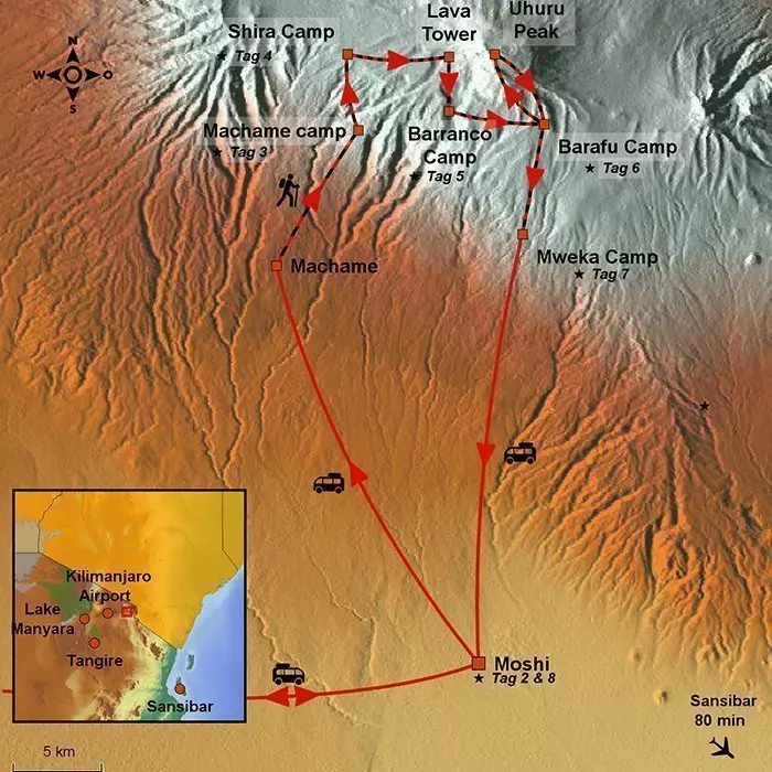 Höhen: Barafu Camp: 4.600 m Seehöhe, Uhuru Peak: 5.895 m Seehöhe, Mweka Camp: 3.100 m Seehöhe