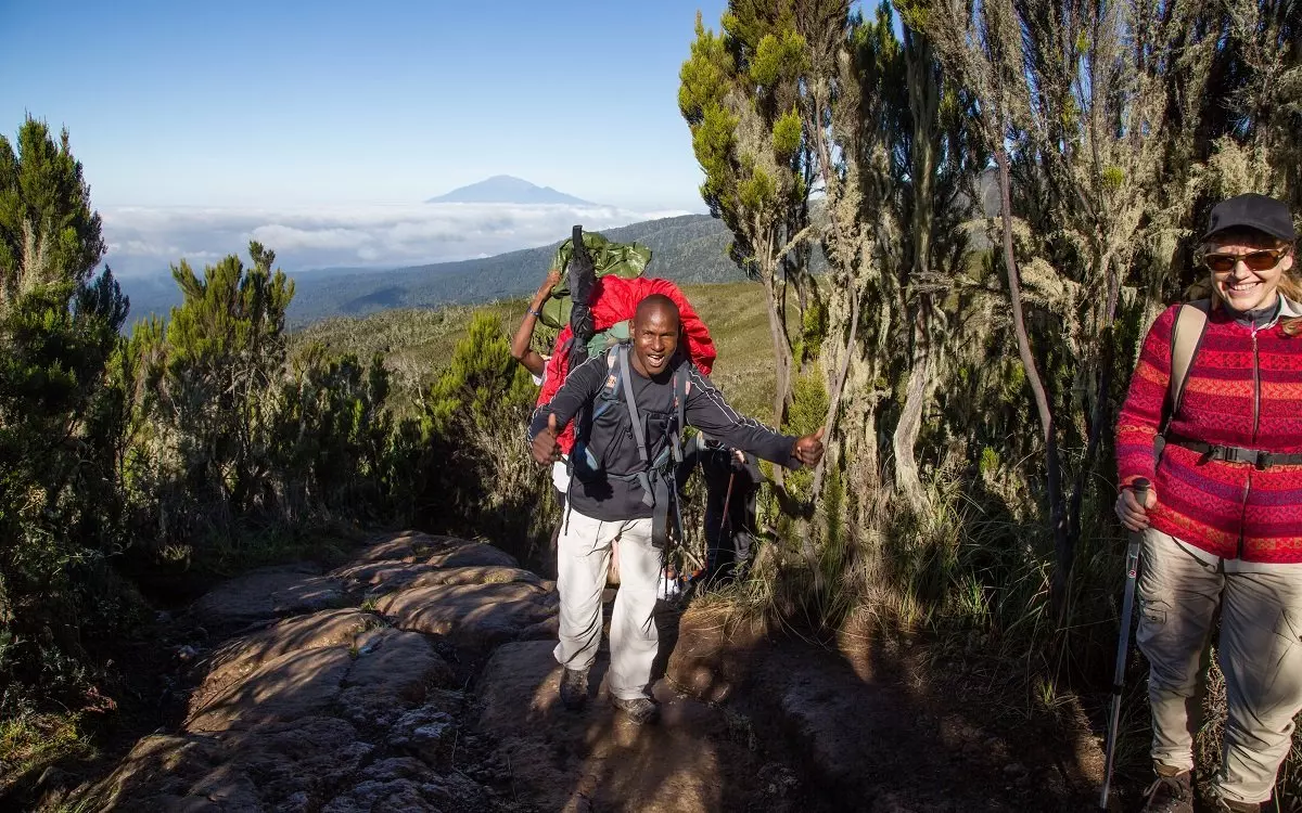 Die Marangu-Route ist auch als Coca-Cola-Route bekannt. Der Startpunkt ist der Marangu Gate, der südöstliche Eingang zum Kilimandscharo-Nationalpark. Sie wandern auf schönen Pfaden durch Wälder und Regenwald. Der Wald lichtet sich und Sie erreichen eine Heidelandschaft mit riesigen Greiskraut-Pflanzen. Der Weg bietet eine herrliche Aussicht auf den Kibo und den Gipfel des Mawenzis. Wir haben einen Tag zur Akklimatisierung vorgesehen, damit Sie sich besser an die Höhe gewöhnen können. Den Tag können Sie dazu nutzen, Mawenzi Tarn Hut oder die Zebra Rocks kennenzulernen. Die Heidelandschaft wird langsam durch eine vegetationslose alpine Landschaft abgelöst, die den Mawenzi mit dem Kibo verbindet. Sie wandern am Gilman’s Point vorbei, dessen Aussicht zum Verweilen einlädt, und steigen dann von Osten hinauf zum Gipfel. Der Abstieg erfolgt an der südöstlichen Seite, wo Sie von vielen Aussichtspunkten einen Ausblick über den Kilimandscharo haben.