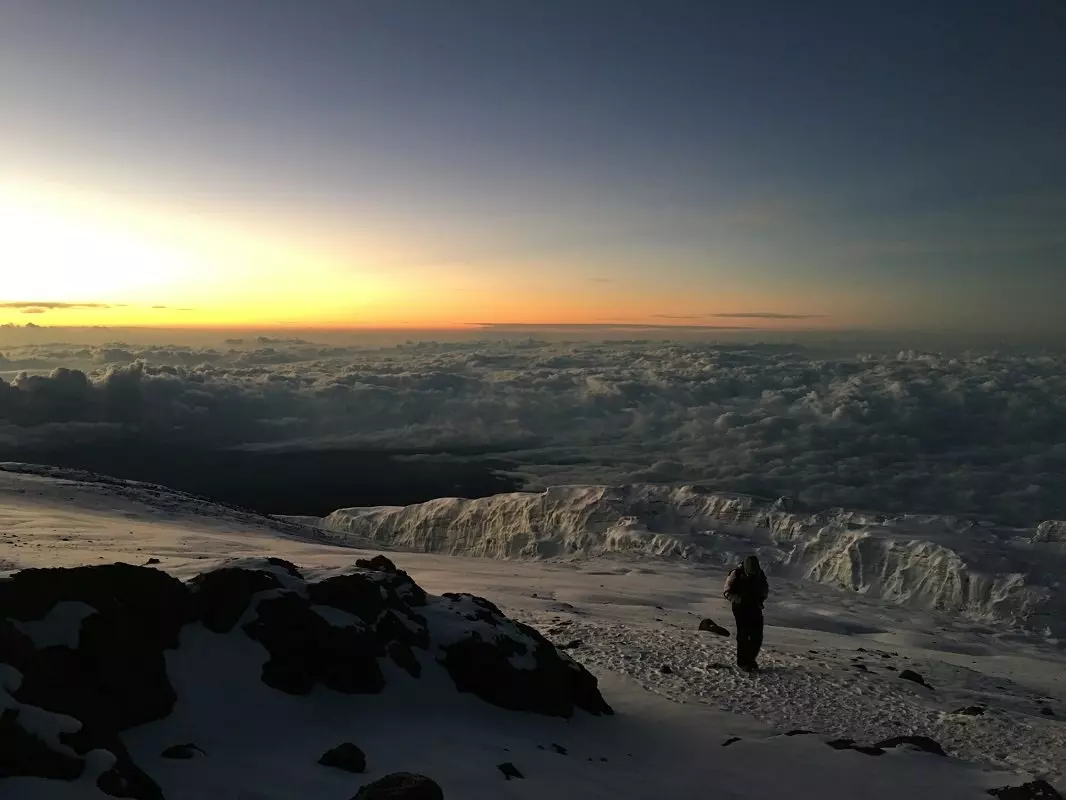 Um Mitternacht werden Sie geweckt und nach einer leichten Mahlzeit beginnt das letzte Stück Weg zum Uhuru Peak. Für die meisten besteht die größte Herausforderung darin, auf dem schwierigen Terrain bei Dunkelheit zu wandern. Das Ziel ist, Stella Point bei Sonnenaufgang zu erreichen. Bei Stella Point wird kurz Halt gemacht, um den Sonnenaufgang zu genießen. Sorgen Sie dafür, nicht zu lange Rast zu machen, da es sonst auf Grund der Kälte und der Müdigkeit fast unmöglich wird, sich wieder aufzuraffen. Der Weg führt Sie an der Kraterkante entlang und das letzte Stück zum Uhuru Peak hat einen gleichmäßigen Anstieg. Abhängig von der Jahreszeit kann auf dem restlichen Weg zum Uhuru Peak, Ihrem endgültigen Ziel auf dem Kilimandscharo, Schnee liegen. Wenn Sie den Gipfel in 5.895 m üb. NHN erreicht haben, können Sie sich selbst beglückwünschen, die phantastische Aussicht genießen und als ewiges Andenken ein Selfie am Uhuru Peak-Schild machen.
