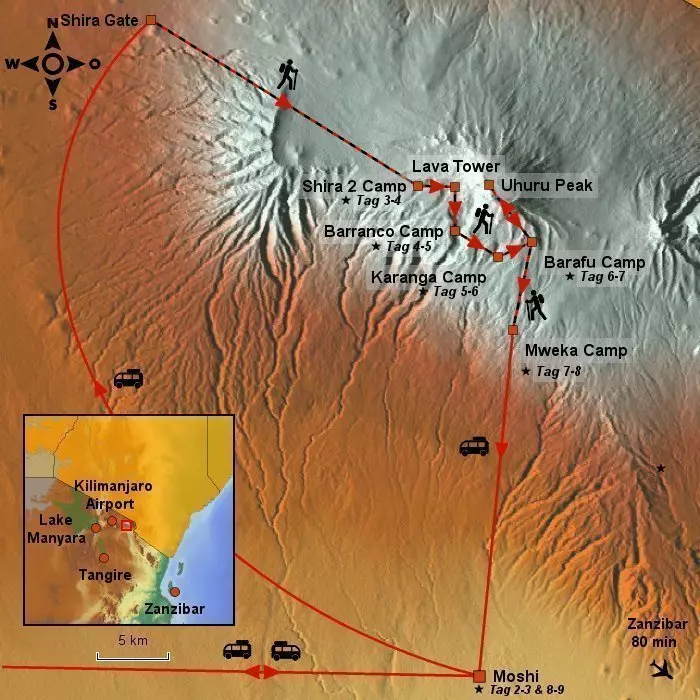 Nationalpark. Die Shira-Route entspricht größtenteils der Lemosho-Route. Der Unterschied ist lediglich, dass die Shira-Route kürzer ist und einen härteren und anspruchsvolleren Start bietet (der erste Übernachtungsort liegt bereits auf 3.840 m üb. NHN). Auf der Shira-Route wandern Sie durch eine abwechslungsreiche Landschaft aus Regenwald, Heide, karger, vegetationsloser alpiner Höhenlandschaft bis zum Uhuru Peak auf 5.895 m üb. NHN. Auf der Strecke haben Sie von vielen Aussichtspunkten eine herrliche Aussicht auf den Mount Meru, das große Kibo-Massiv und den Gipfel des Mawenzis, der in den afrikanischen Himmel ragt. Den Lunch nehmen Sie am Fuße des berühmten Lava Towers ein und besteigen anschließend die Great Barranco Wall beim Heim-Gletscher, der wie eine riesige Gardine über das Bergmassiv ragt. Der Aufstieg zum Gipfel auf der letzten Etappe erfolgt von Osten, wo Sie Zeuge des wunderschönen Sonnenaufgangs am Stella Point werden. Der Abstieg erfolgt auf der Mweka-Route im Süden.