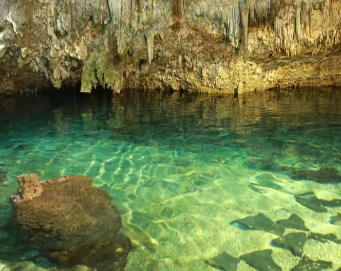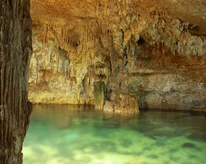 Nach dem Besuch der Ruinen und einem kurzen Mittagessen (inbegriffen) geht es weiter zu der in der Nähe liegenden Cenote Choo-Ha, einer stimmungsvollen unterirdischen Süßwassergrotte mit kristallklarem Wasser und schönen Tropfsteinformationen. Hier haben Sie Zeit für ein erfrischendes Bad in einer friedlichen Umgebung. An der Cenote gibt es Umkleiden mit WC und es werden Schwimmwesten verliehen.