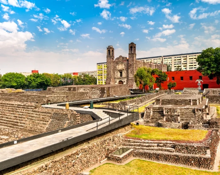 Der erste Stopp der Reise ist die Plaza de las Tres Culturas, oder 'Platz der drei Kulturen', die Mexikos drei historische Epochen symbolisiert. Hier finden Sie Überreste der präkolumbianischen Aztekenruinen, eine spanische Kolonialkirche und moderne mestizische mexikanische Gebäude, in denen das Außenministerium untergebracht ist.