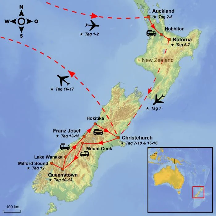 Ihre Reise beginnt in Auckland, der größten Stadt des Landes, und führt Sie weiter durch das zauberhafte Hobbiton nach Rotorua – berühmt für seine sprudelnden Thermalquellen und die reiche Māori-Kultur.