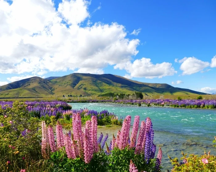 Von Christchurch fahren Sie durch die sanft geschwungenen Canterbury-Ebenen weiter ins zentrale Hochland und zu den schneebedeckten Southern Alps. Der erste Stopp ist am ikonischen Lake Tekapo (Takapō), bekannt für sein kristallklares, türkisblaues Wasser und die kleine steinerne Kapelle, die Church of the Good Shepherd, die vielleicht zu den meistfotografierten Orten des Landes zählt.