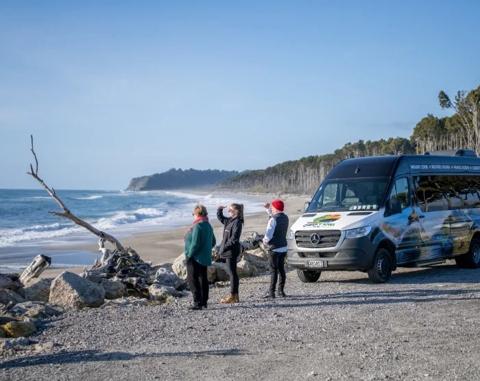 Es wird auch ein Halt bei den 28 Meter hohen Thunder Creek Falls eingelegt, bevor Sie durch den Haast-Pass weiter an die wilde Westküste Neuseelands gelangen, wo raue Strände auf dichten Regenwald treffen.