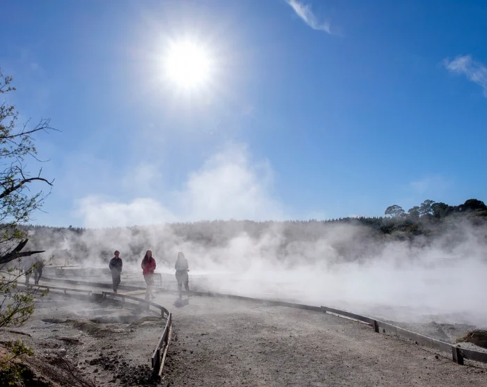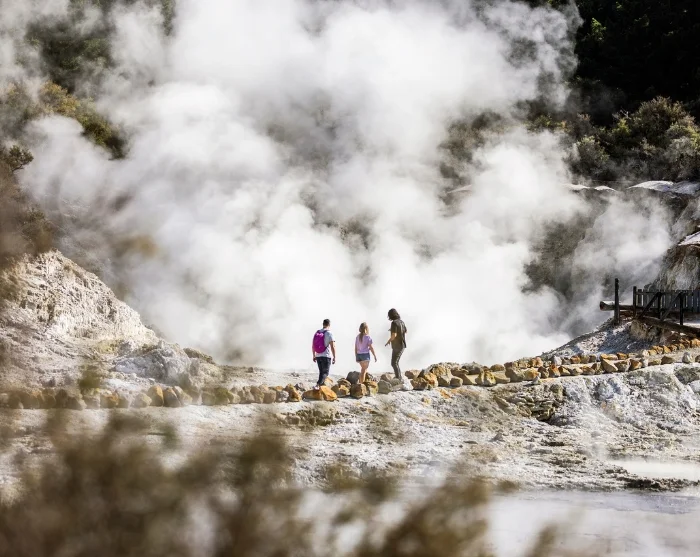 Bei Ihrer Ankunft beginnt Ihre selbstgeführte Wanderung durch den Park, die etwa 1 – 1 1/2 Stunden in Anspruch nimmt. Sie gehen durch eine Landschaft mit dampfenden Schwefelquellen, blubbernden Schlammpfützen und brühend heißen Wasserfällen – umgeben von Schwefelgeruch, warmem Nebel und kristallisierenden Mineralablagerungen. Der Weg ist deutlich markiert und einfach. Unterwegs stehen Informationstafeln und gibt es Aussichtspunkte mit Erklärungen zur einmaligen Geologie des Gebietes und der Bedeutung der Maori.