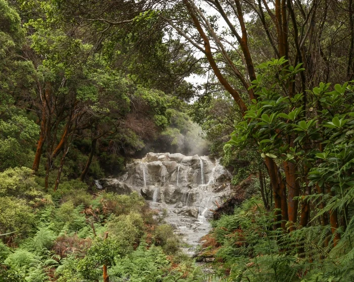 Sie kommen an Orten wie „Inferno Pools“, „Sulphur Crystal Valley“ und „Cooking Pool“ vorbei, an denen die Temperatur fast 100 Grad erreicht. Einer der Höhepunkte ist Kakahi Falls – der größte warme Wasserfall auf Neuseeland, der früher von den Maori-Kriegern nach dem Kampf zur Heilung verwendet wurde.
