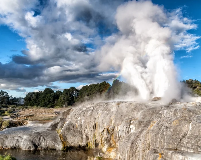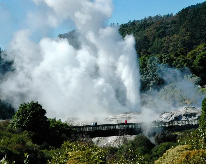 Sie werden in Ihrem Hotel in Rotorua abgeholt und unterbrechen die Tour ein erstes Mal am Teu Puia Thermal Park. Dort erleben Sie blubbernden Schlamm und dramatische Geysire, u. a. den Geysir Pōhutu, der mehrmals täglich bis zu 30 Meter in die Höhe spritzt.