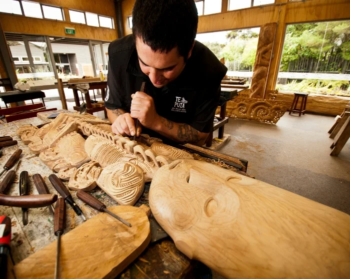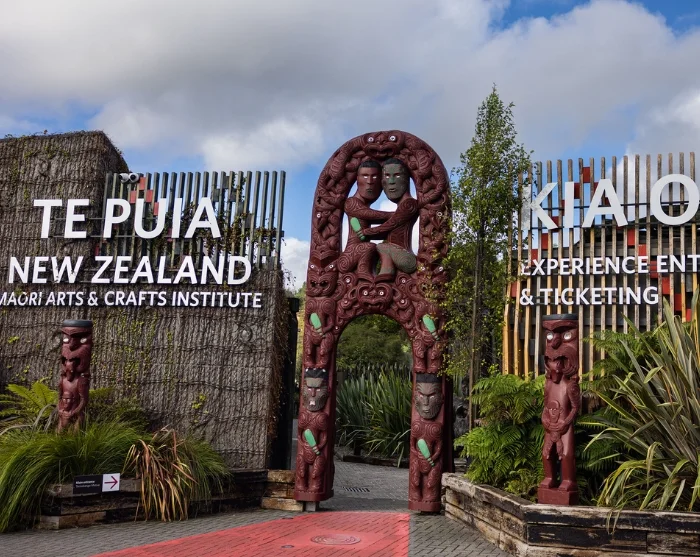 Im Te Puia befindet sich auch das New Zealand Māori Arts and Crafts Institute, wo Sie Web- und Schnitzkunst nach alter Tradition erleben können. Außerdem können Sie einem traditionellen Maoriauftritt beiwohnen.