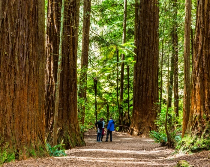 Im Redwood Wald stehen viele beeindruckende kalifornische Redwood Bäume (Sequoia sempervirens), die zu Beginn des 20. Jahrhunderts im Rahmen eines Experiments gepflanzt wurden. Heute sind einige dieser Bäume über 70 Meter hoch und mehr als 100 Jahre alt. Es hat etwas Magisches an sich, wenn man zwischen diesen Riesen wandelt.