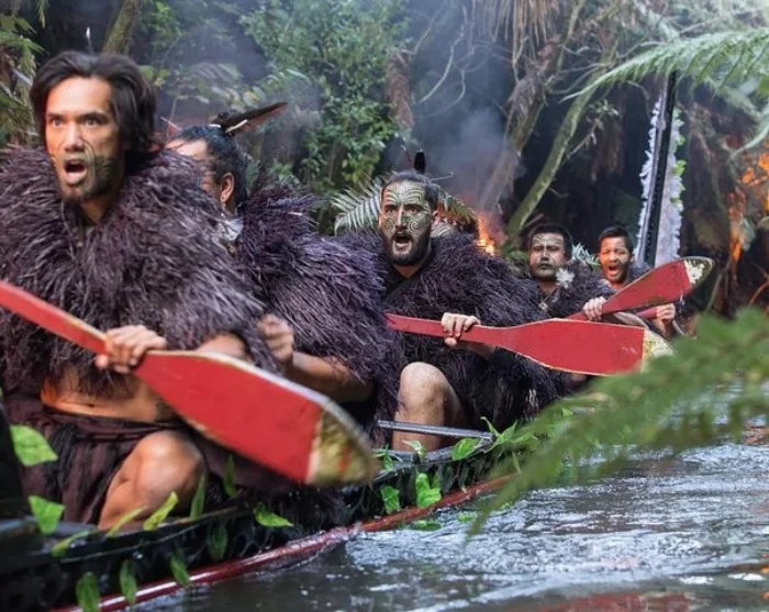Unter anderem sehen Sie Krieger in einem traditionellen Kriegerkanu (Waka) den Fluss Wai-o-Whiro hinabpaddeln.