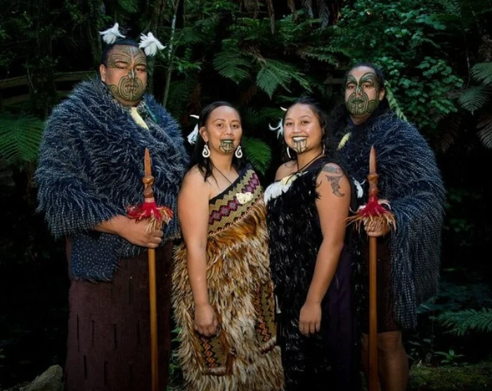 Die intensive Darbietung wird von Maoris in traditioneller Kleidung mit charakteristischen Gesichts- und Körpertätowierungen aufgeführt, die für diesen Anlass aufgemalt werden.